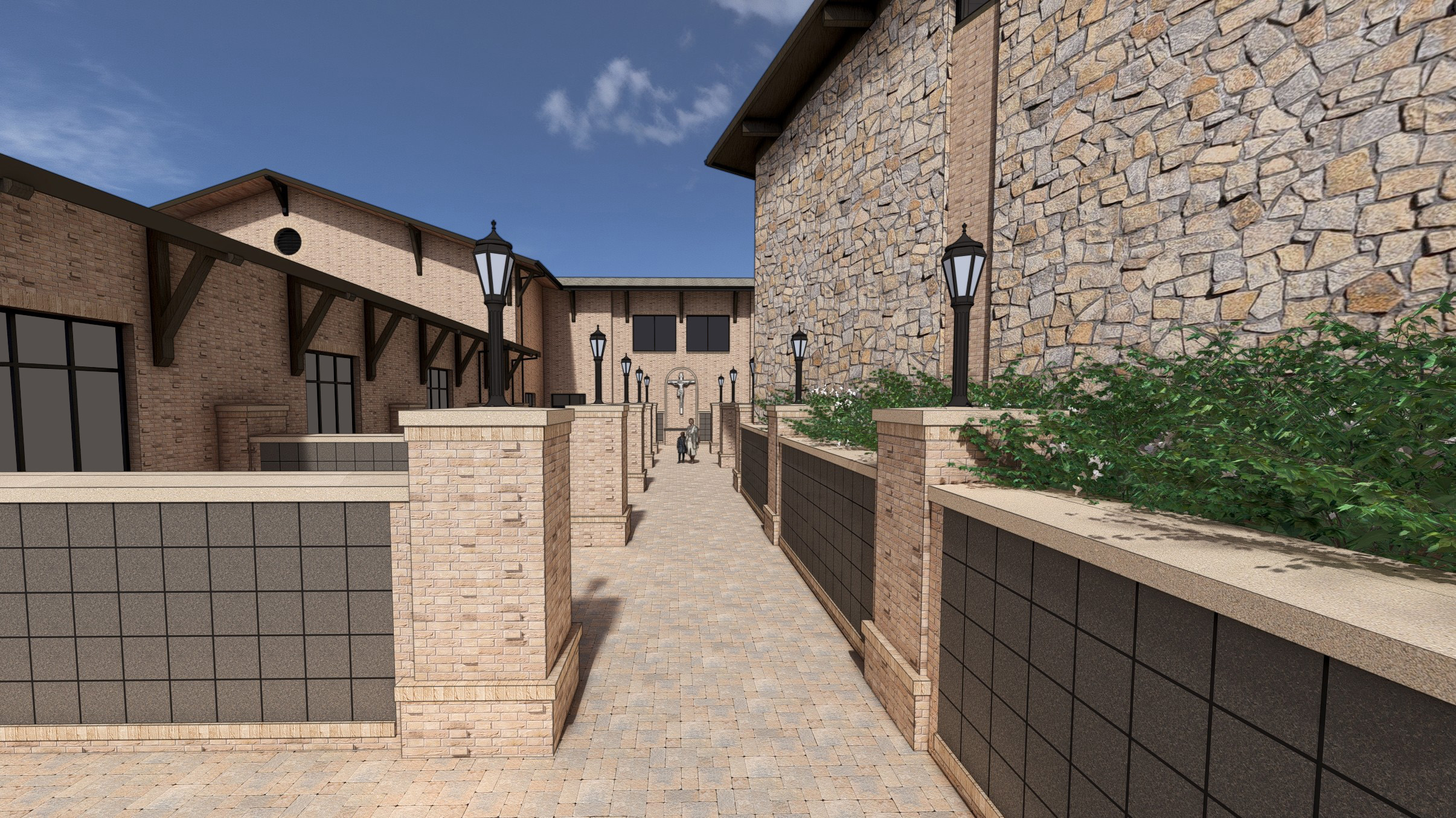 As part of a master plan for St. Jude the Apostle Catholic Church, Smith Boland Architects was commissioned to design a new columbarium to provide a sacred space for remembrance. This intimate courtyard space forms a serene threshold between the existing church and new parish hall, creating a place of quiet reflection within the heart of the campus. The design integrates traditional materials consistent with the church architecture to establish harmony and continuity with the existing structures. A central crucifix serves as a focal point, while landscaped plantings and thoughtfully placed lighting enhance the sense of serenity and reverence.